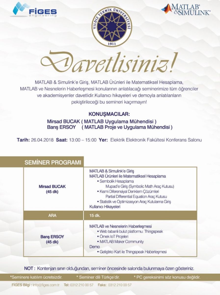 26 Nisan 2017, Perşembe günü Figes firması tarafından tüm bölümlerimizin öğrencilerine yönelik MATLAB&Simulink semineri verilecektir. Temel seviyede MATLAB&Simulink kullanımının anlatılacağı seminer öğrencilerimiz için faydalı olacaktır.