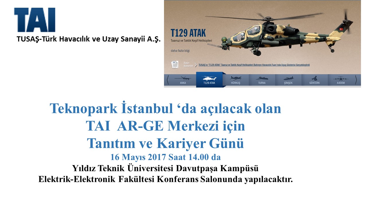 YER DEĞİŞİKLİĞİ YAPILMIŞTIR!!! TAI tarafından İstanbul'da oluşturulacak AR-GE merkezi için tanıtım ve kariyer günü hakkında ayrıntılara ekli ilandan ulaşabilirsiniz. Özellikle kariyer planlarını AR-GE amaçlı yapan öğrencilerimizin katılımı önem arz etmektedir. YER DEĞİŞİKLİĞİ YAPILMIŞTIR!!!